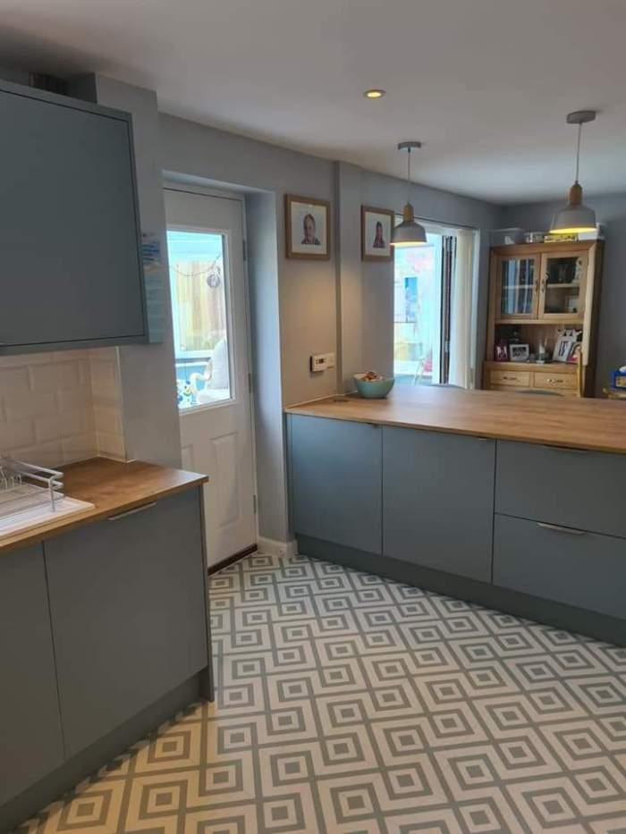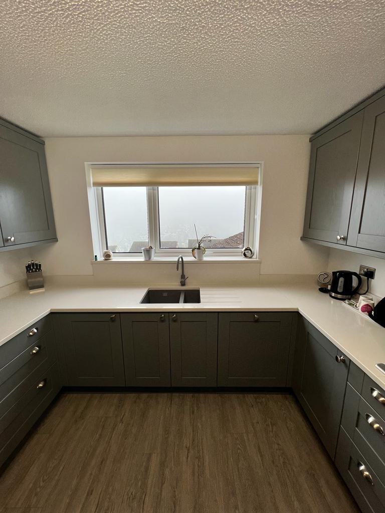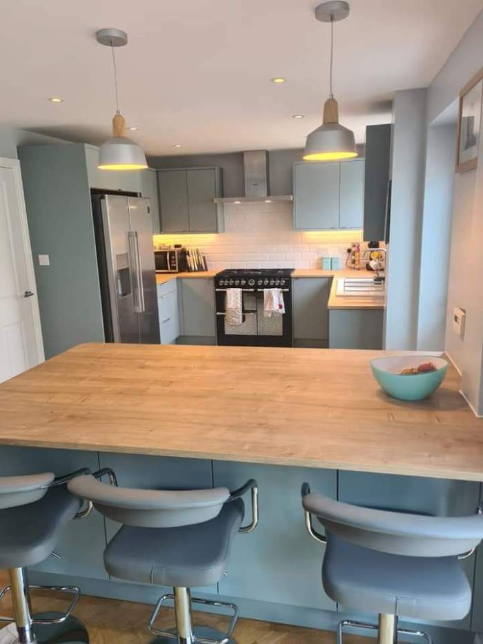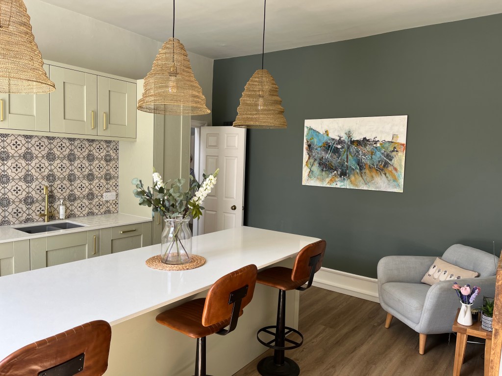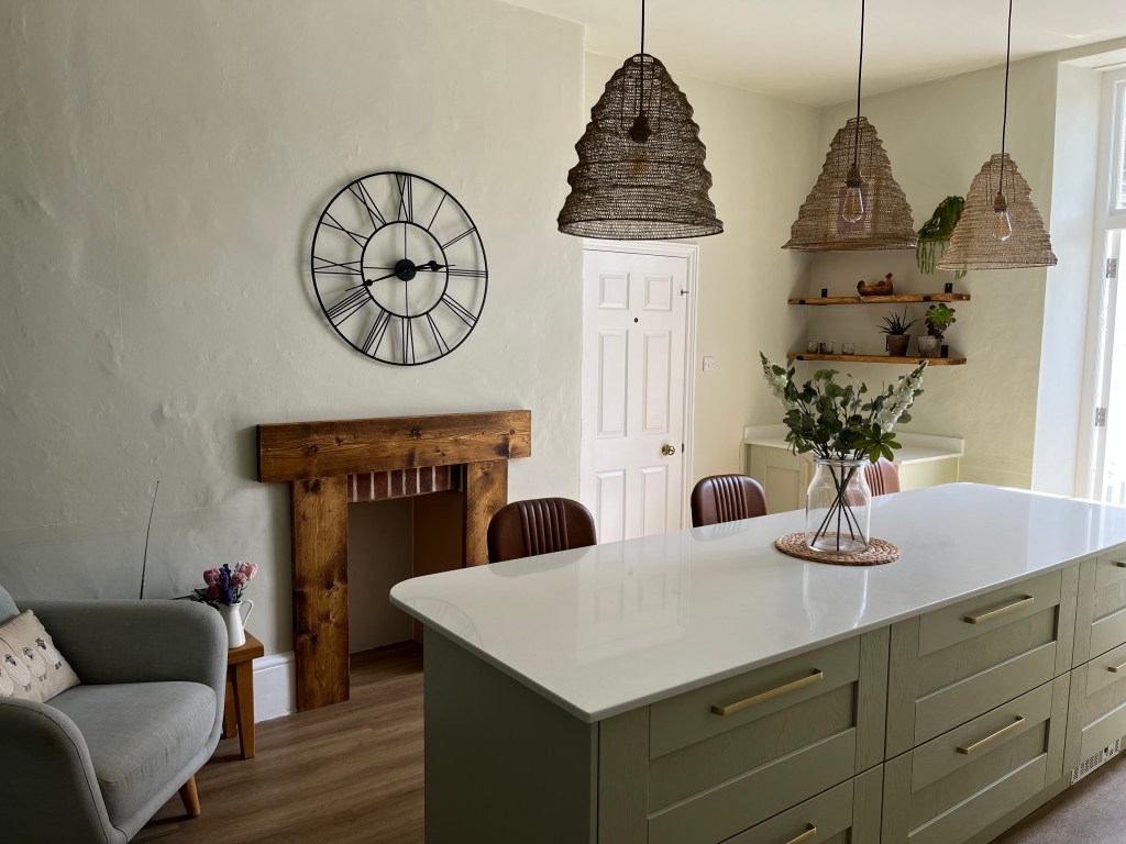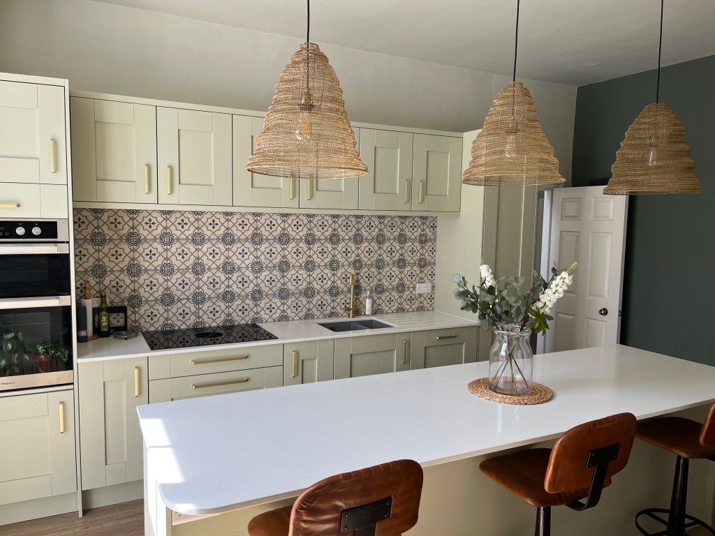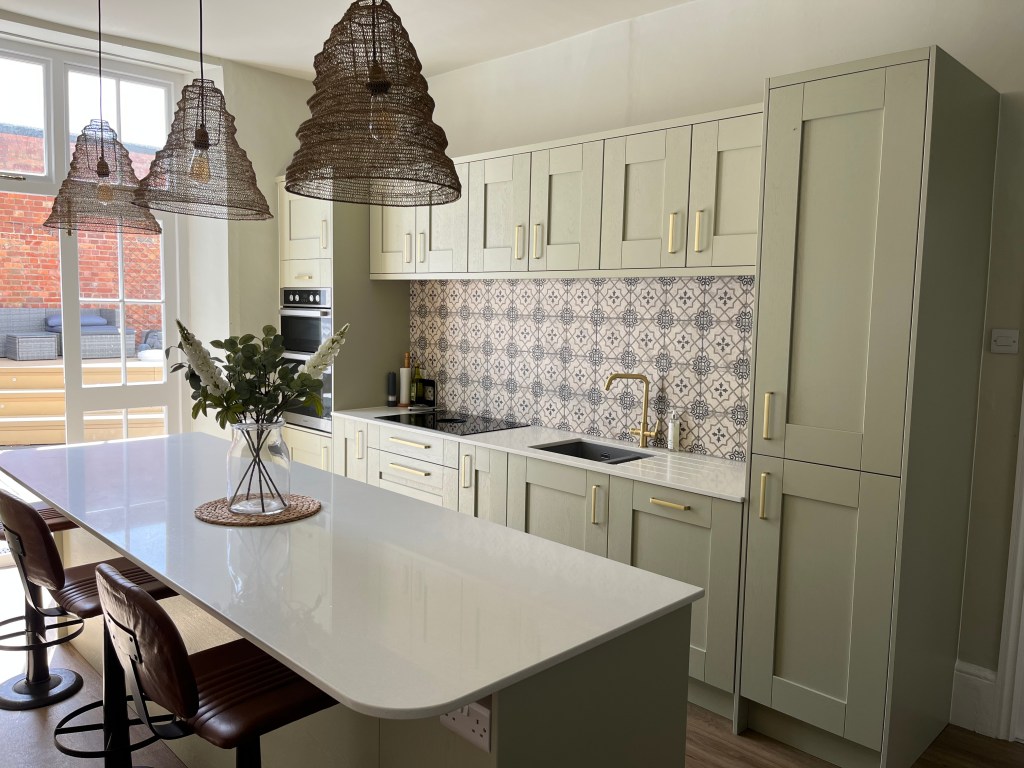 Our customers opted for a beautiful Sage Green Shaker door, along with a white Quartz worktop, Brass Handles and the most beautiful Fired Earth tiles – which I really feel brings this kitchen to life.