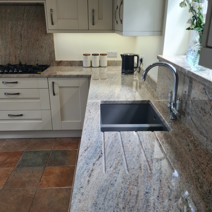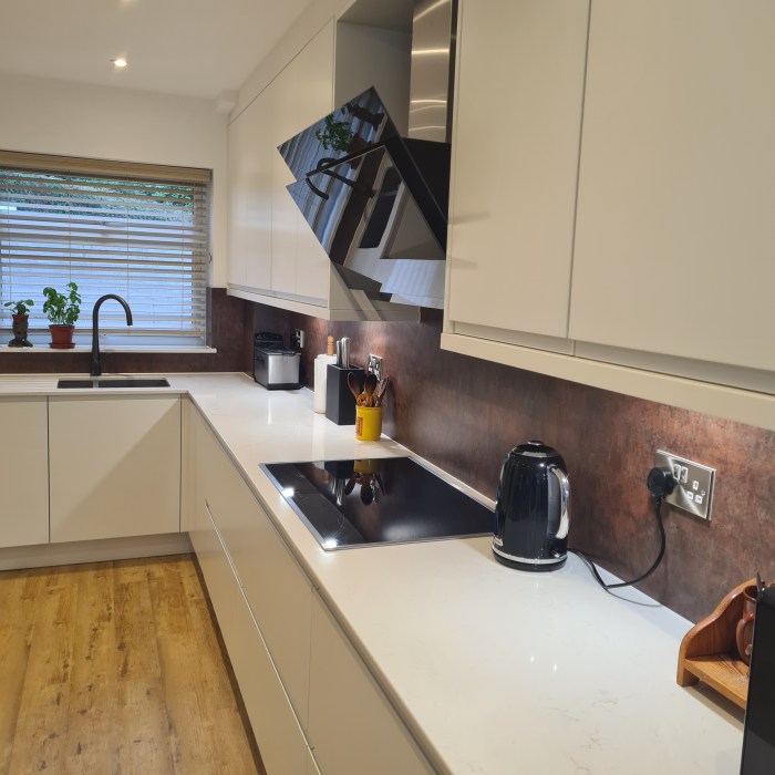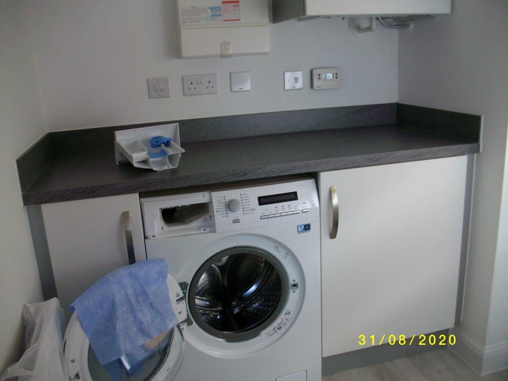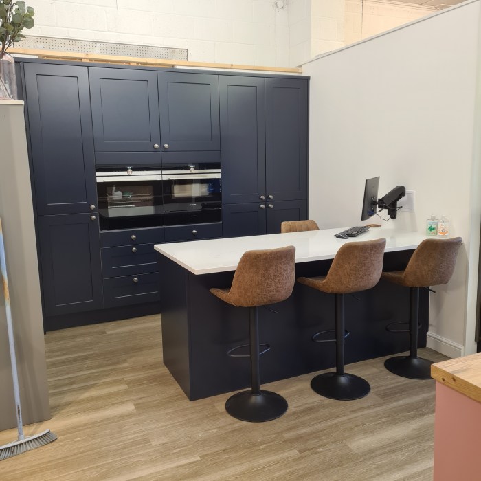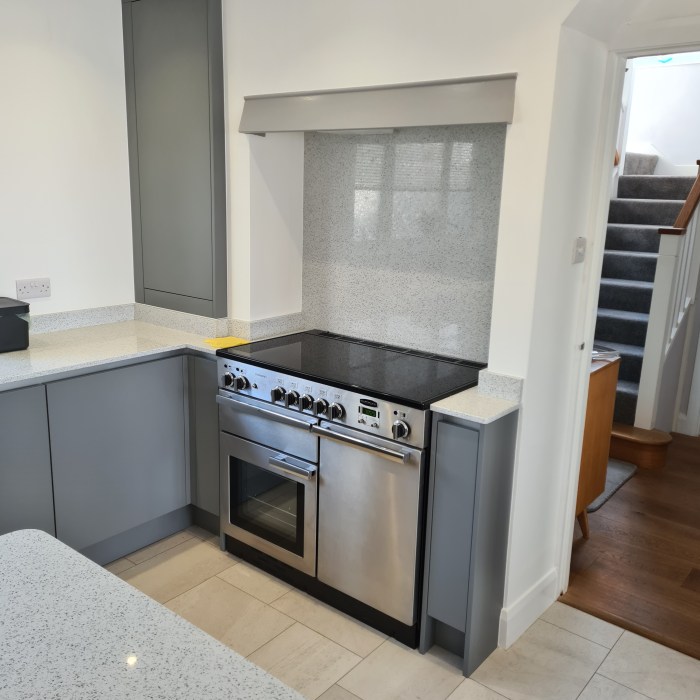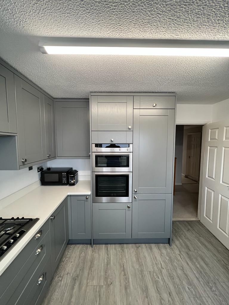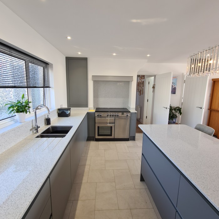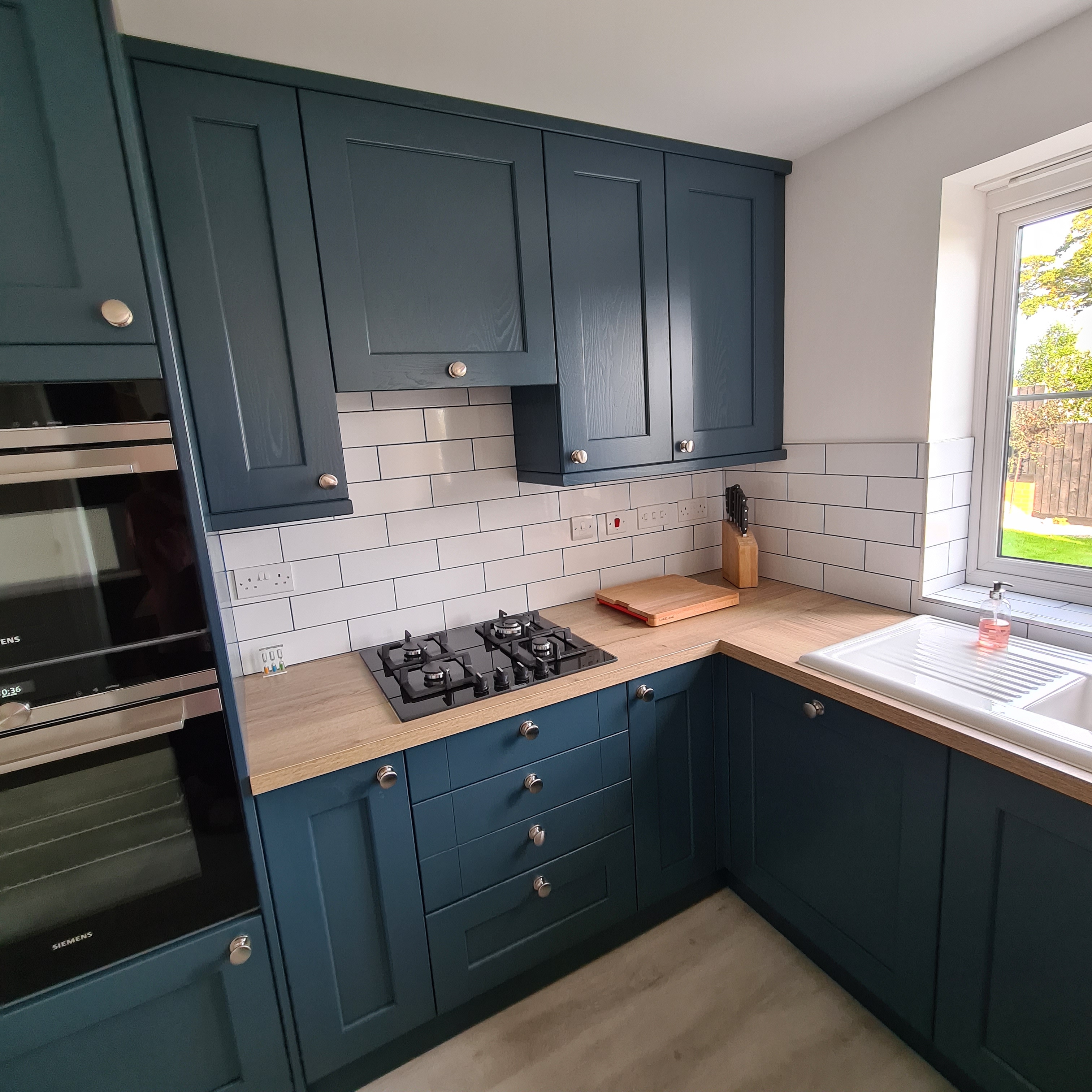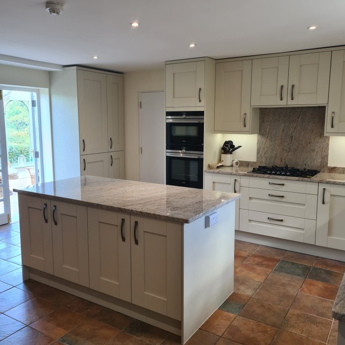Our customers opted for a beautiful Sage Green Shaker door, along with a white Quartz worktop, Brass Handles and the most beautiful Fired Earth tiles – which I really feel brings this kitchen to life.